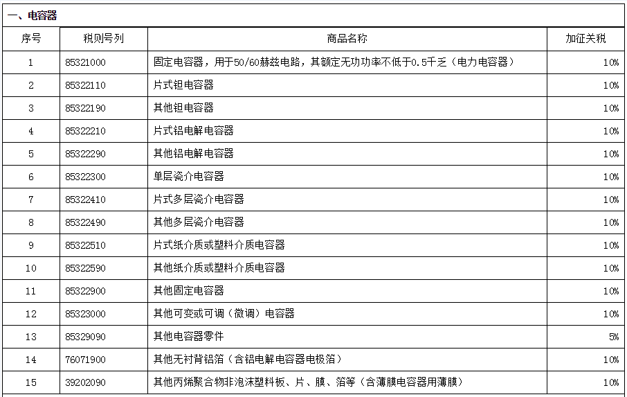 Als Reaktion auf die Maßnahmen, die die Vereinigten Staaten ab dem 24. September auf Waren mit Ursprung in China im Wert von 200 Milliarden US-Dollar einen Einfuhrzoll von 10% erheben werden, hat unsere Regierung am 24. September 2018 um 12:01 Uhr beschlossen, Zölle auf Waren zu erheben, die der Liste der Waren unterliegen, die den Vereinigten Staaten und Kanada als Anhang der Ankündigung Nr. 63 des Handelsministeriums und der Ankündigung Nr. 6 des Steuerausschusses unterliegen. Unter ihnen wird ein Zoll von 10% auf insgesamt 3.571 in den Anhängen 1 und 2 der Ankündigung aufgeführten Steuerpositionen und ein Zoll von 5% auf insgesamt 1.636 in den Anhängen 3 und 4 der Ankündigung aufgeführten Steuerpositionen erhoben. Die vom Informationszentrum der China Electronic Components Industry Association zusammengestellten Steuerpositionen für die Elektronikkomponentenindustrie sind in der folgenden Tabelle aufgeführt: